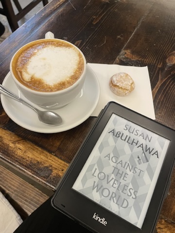 Looking at the menu, I see that I can get an almond cookie for 50 cents with the purchase of a coffee. Deciding to treat myself, I grab a cookie. I turn on my Kindle to start reading Susan Abulhawa’s Against the Loveless World. I sip my cappuccino. The first pages of the novel is a glossary that translates the foreign words in the novel. I glance through the Arabic words.